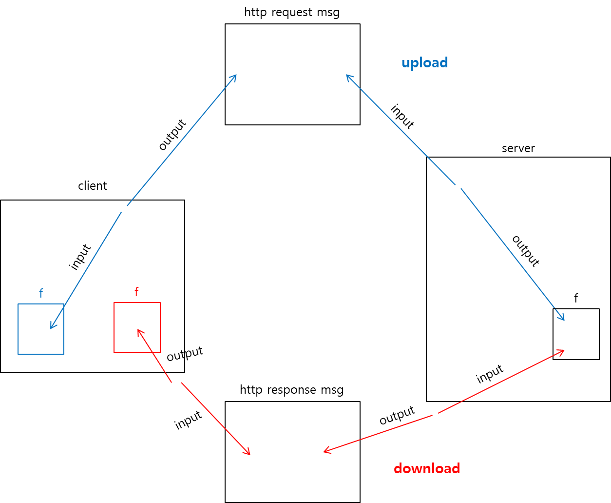 파일을 업로드/다운로드는 아래와 같이 입출력의 연속입니다.