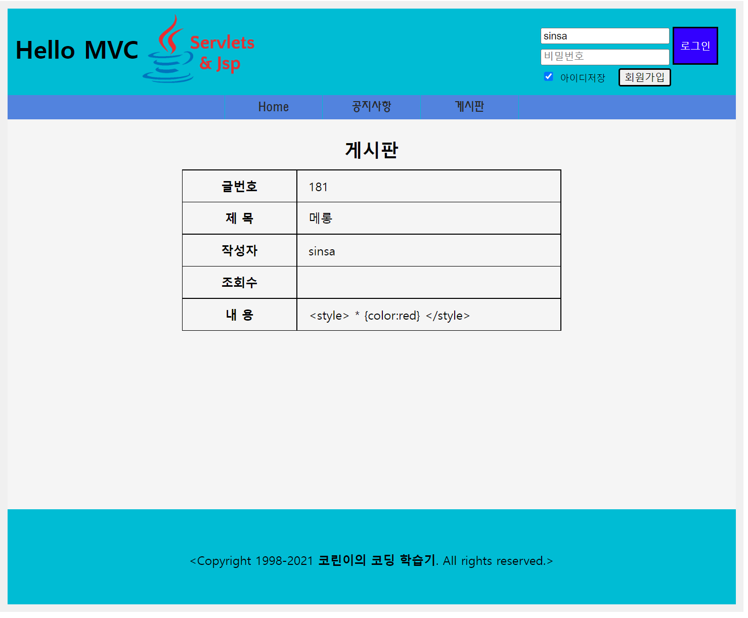 escaping 처리를 했기 때문에 문자 그대로의 "<", ">"로 받아들여서 더이상 style태그 혹은 script태그가 적용되지 않는 것을 확인할 수 있습니다.
