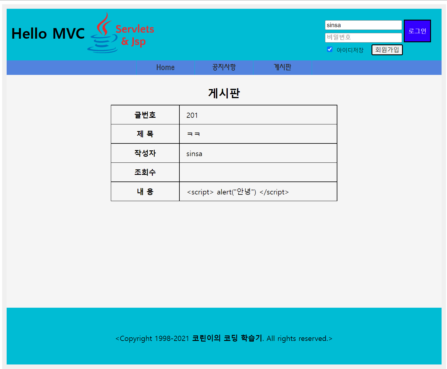 script 태그도 마찬가지로 script 태그로 받아들여서 alert가 실행되는 것을 확인할 수 있습니다.