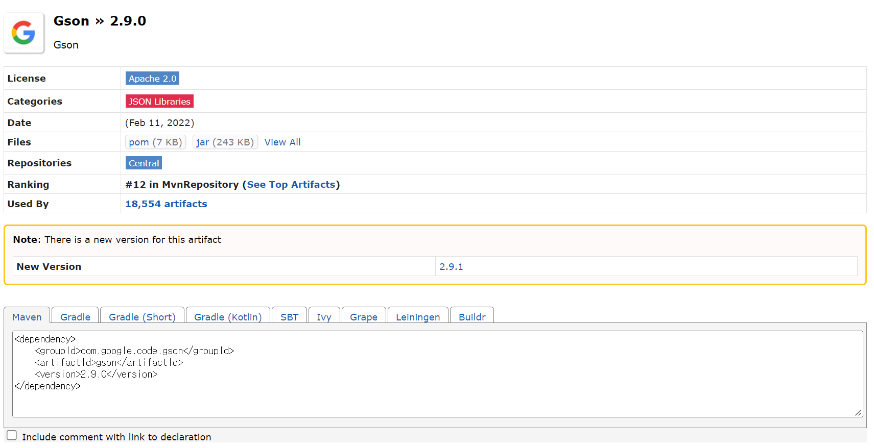 기존에는 파일을 다운로드 받아 WEB-INF/lib 파일에 직접 저장하여 사용 (프로젝트가 gson.jar에 의존)하였지만,