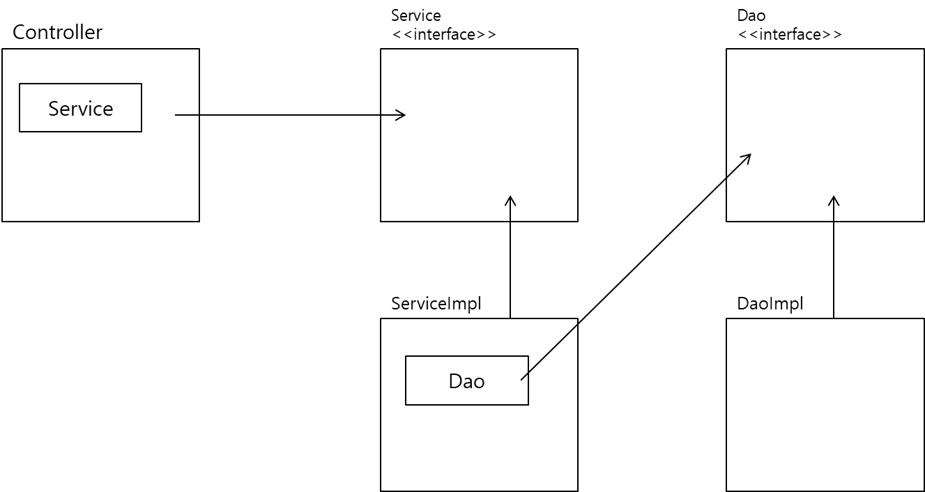 각 Controller는 StudentServiceImpl 를 의존하고 있으며, StudentServiceImpl는 StudentDaoImpl를 의존하고 있습니다.