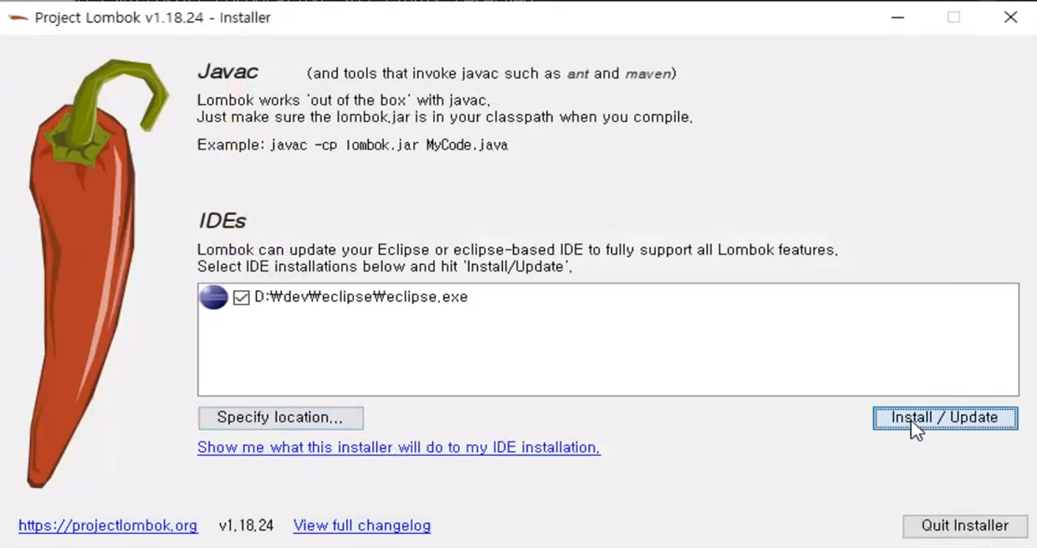 Specify location 으로 실행 파일을 찾아준 후 (Lombok이 자동으로 찾아주긴 하지만 경로 다를 때도 있음), Install/Update 버튼을 눌러줍니다.