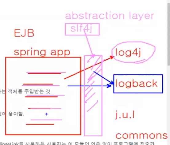 * Log4j를 사용하다가 logback으로 변경하고자 할 때 직접 모듈을 가져와 사용하면, spring app에서 모든 코드를 변경해야 하는 번거로움이 있지만, abstraction layer를 제공해주기 때문에 직접 참조하여 사용하지 않음 → 변경이 용이, 유지보수 좋음