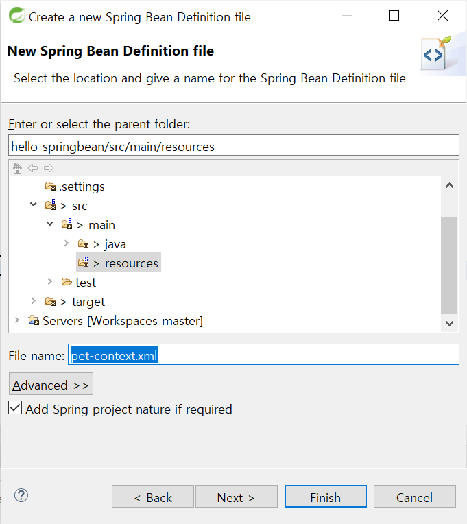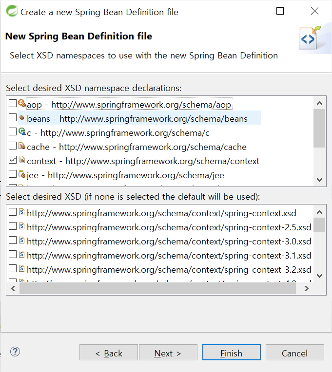 beans는 자동으로 포함되며, context 네임스페이스를 사용하기 위하여 context 체크 후 Finish