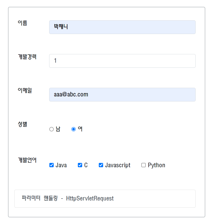 servlet/jsp에서의 사용자 입력 값 처리와 동일하게 HttpServletRequest, HttpServletResponse를 이용하여 사용자 입력 값 처리를 하였습니다.