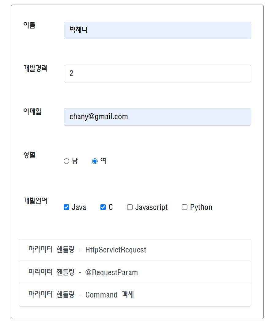 INFO : com.ce.spring2.demo.controller.DemoController - dev = Dev(no=0, name=박채니, career=2, email=chany@gmail.com, gender=F, lang=[Java, C], createdAt=null)