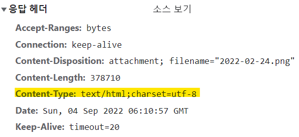 다운로드는 잘 되지만 네트워크 상의 응답 헤더를 확인해보면 Content-Type이 설정한 타입이 아닌 'text/html'로 받아온 것을 확인할 수 있습니다.
