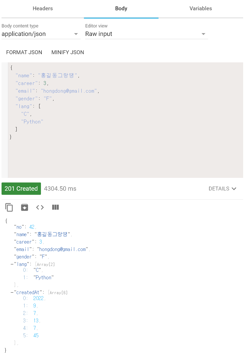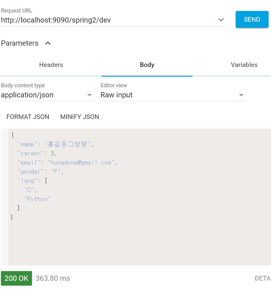 DEBUG: com.ce.spring2.demo.controller.DevRestController - dev = Dev(no=0, name=홍길동그랑땡, career=3, email=hongdong@gmail.com, gender=F, lang=[C, Python], createdAt=null)