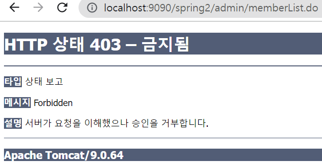 honggd로 로그인 후 /admin/memberList.do 접근 시 (해당 권한을 갖고 있지 않은 사람이 접근 시)