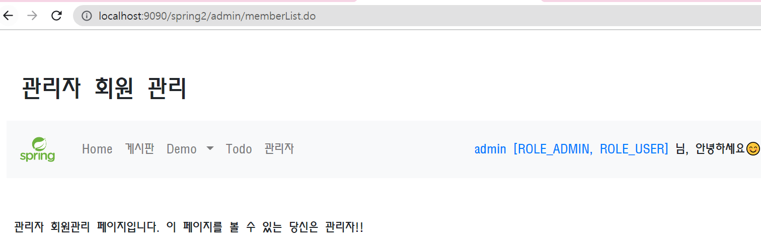 admin 로그인 후 /admin/memberList.do 접근 시 (해당 권한을 가진 사람이 접근 시)