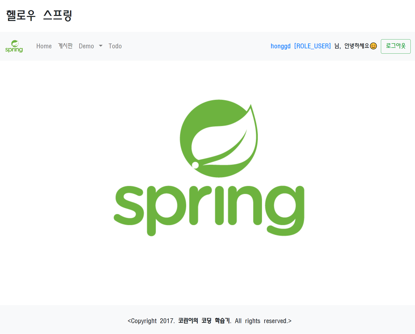 설정해둔 honggd, 1234 (bcryptPasswordEncoder처리) 를 입력 후 로그인하면 아래와 같이 메인 페이지가 나타납니다.