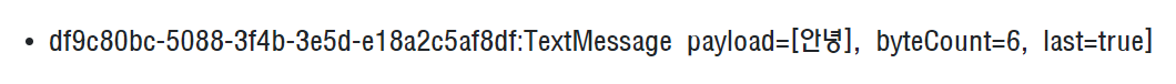 DEBUG: com.ce.spring2.ws.controller.EchoHandler - [message] df9c80bc-5088-3f4b-3e5d-e18a2c5af8df : 안녕