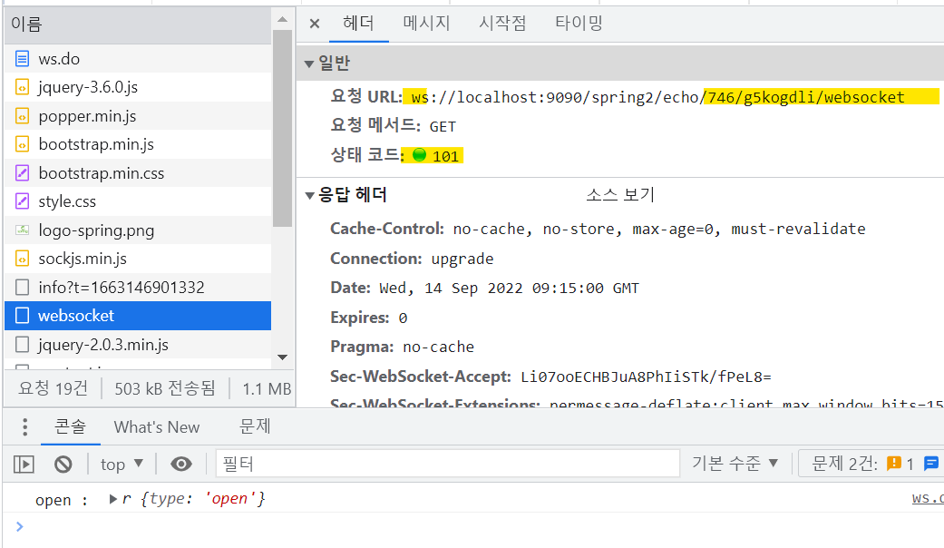 네트워크 탭을 살펴보면, 요청 URL의 프로토콜이 ws로 변경된 것을 확인할 수 있고, 상태 코드가 101인 것을 확인할 수 있습니다.