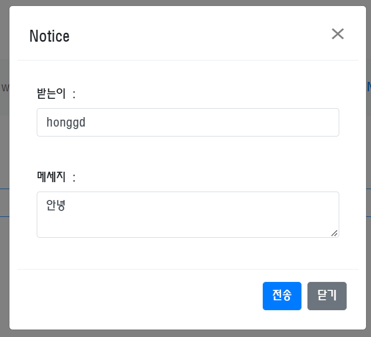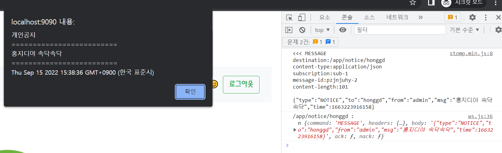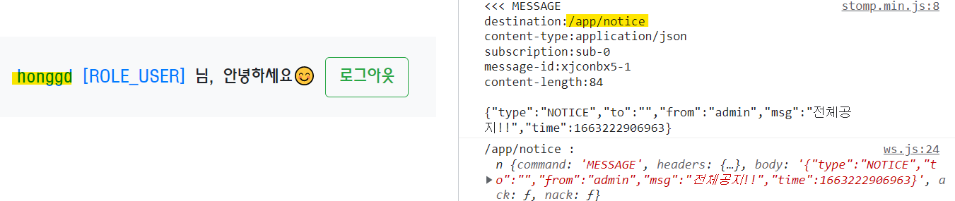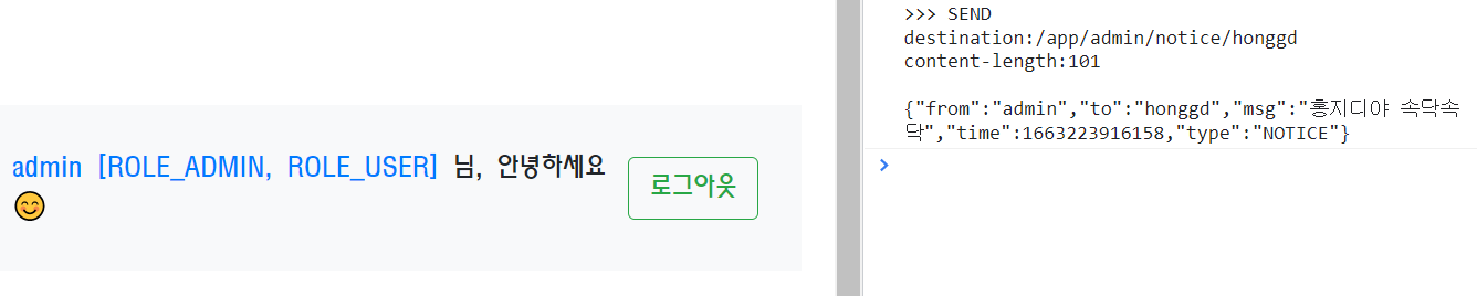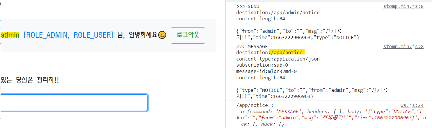 관리자 또한 '/app/notice'의 구독자이므로 메세지를 보내고, 그대로 돌려받았습니다.