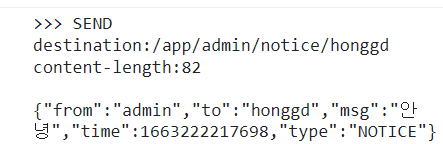받는이를 설정하였기 때문에 '/app/admin/notice/(memberId)'로 잘 전송 된 것을 확인할 수 있습니다.