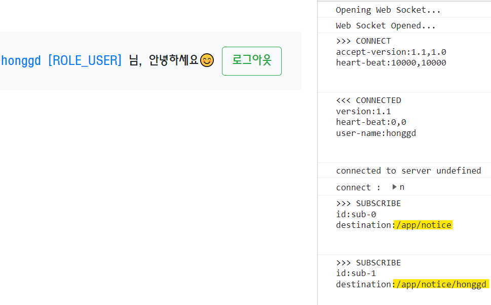 로그인 시 위와 같이 "/app/notice"와 "/app/notice/(memberId)" 구독처리하는 것을 확인할 수 있습니다.