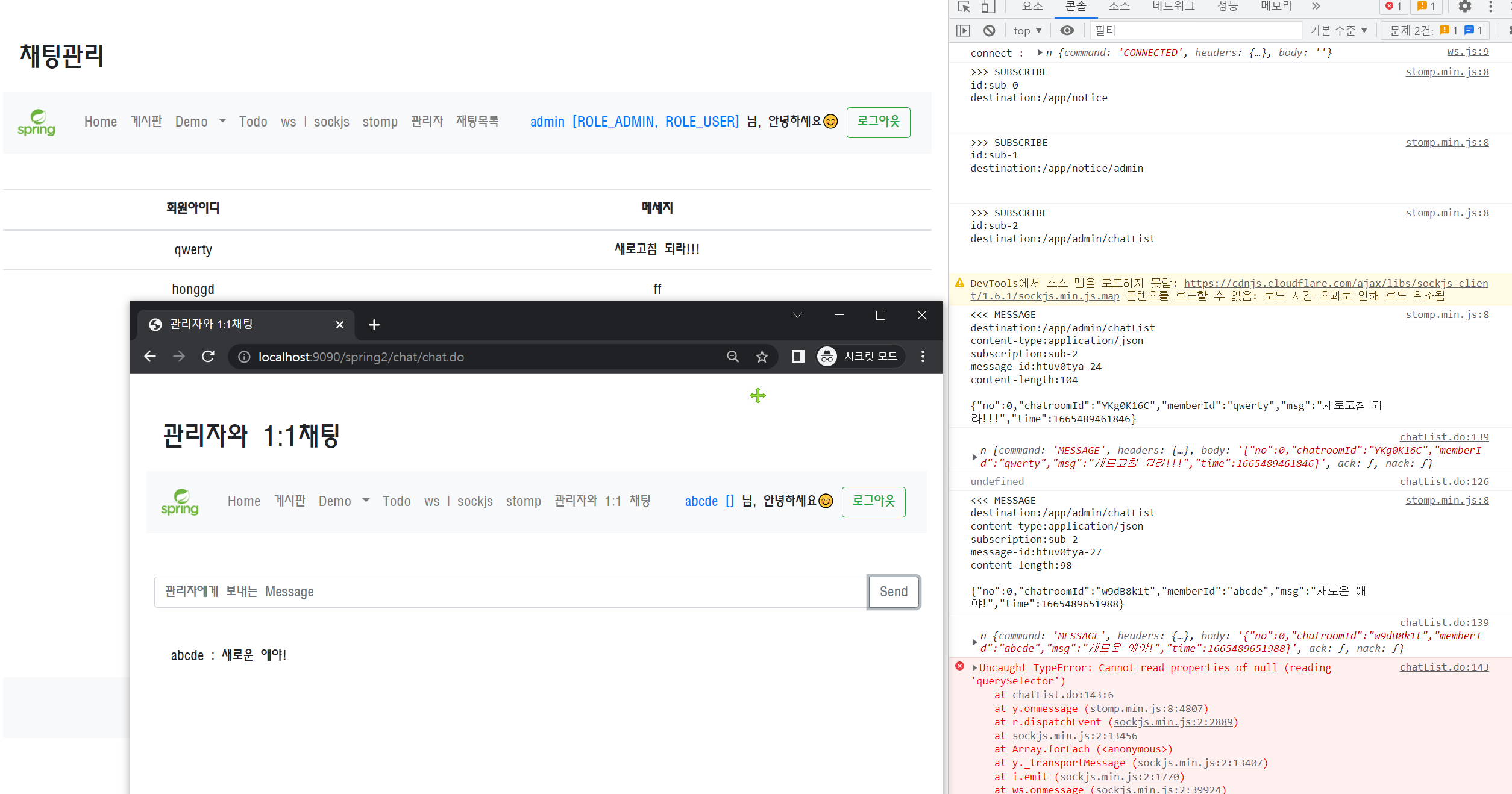 메세지를 보낼 때 '/app/admin/chatList'에도 보내주어 이를 chatList 페이지에서 구독 후 처리 해주겠습니다.