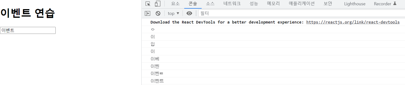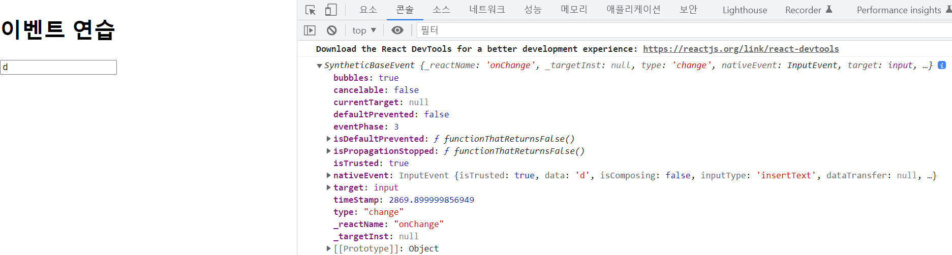 onChange 이벤트를 설정하였고, input에 값을 입력하니 이벤트 객체가 콘솔창에 나타난 것을 확인할 수 있습니다.