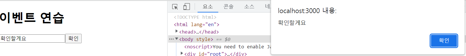 두 번째 input 박스에서 입력 후 Enter를 누르니 handleClick 메소드가 실행되어 alert 창이 띄워지는 것을 확인할 수 있습니다.