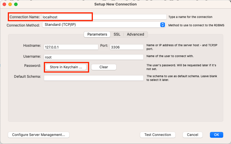 Connection Name에는 localhost, Password에서 Store in Keychain... 버튼 클릭