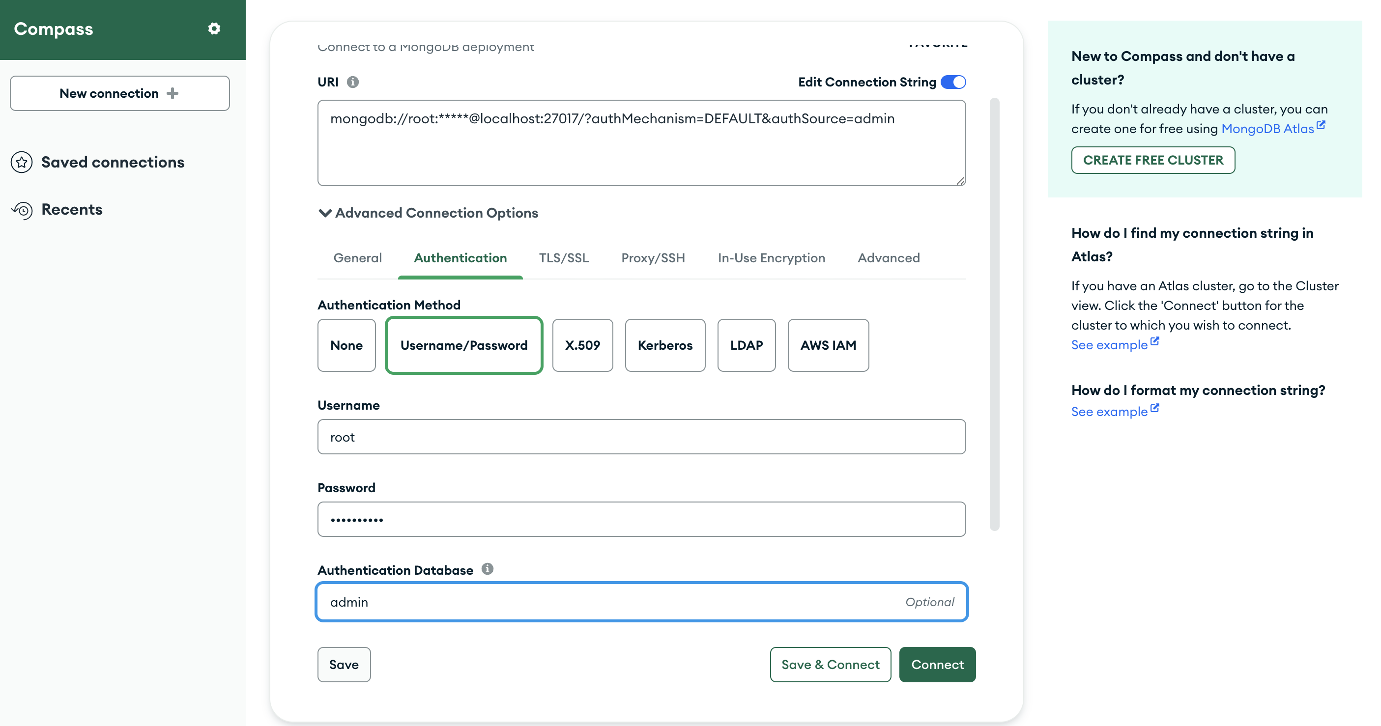 Username, Password, Authentication Database를 입력해준 후 Connect 버튼을 누릅니다.