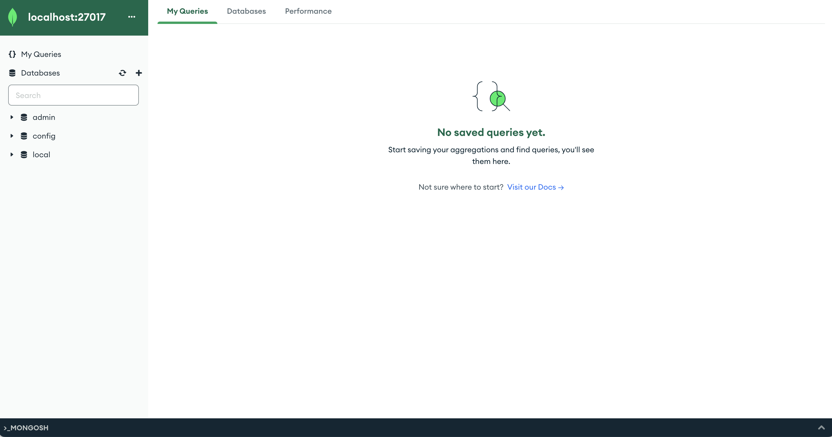 + 버튼을 사용하여 데이터베이스를 생성하거나, mongosh를 이용하여 생성할 수 있습니다.