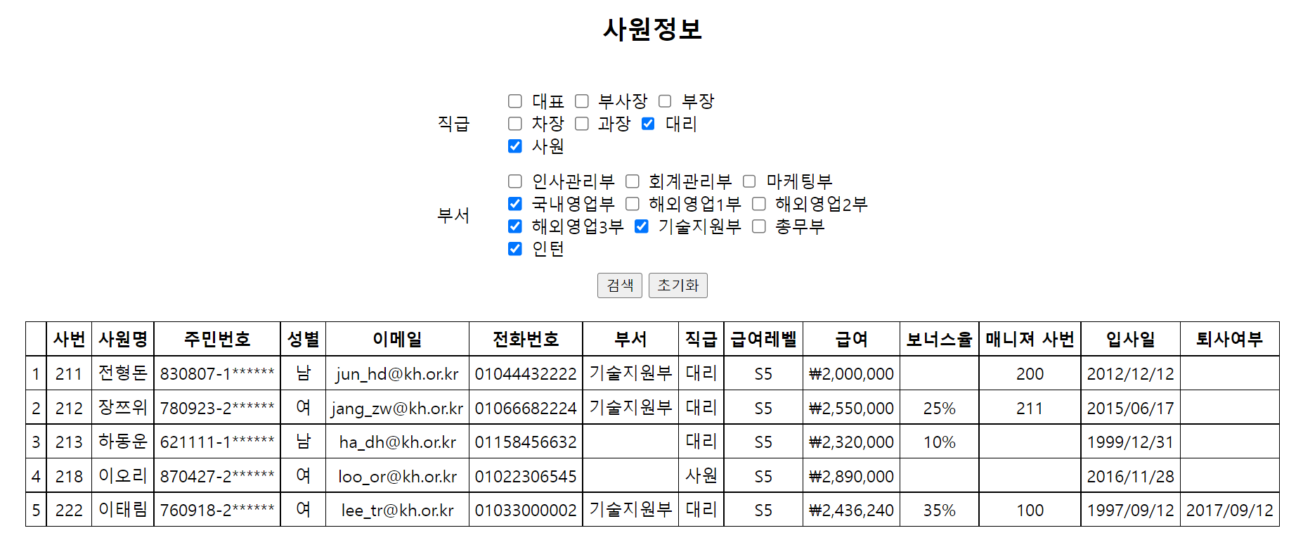 직급, 부서 리스트 나열 및 검색 기능 구현하기